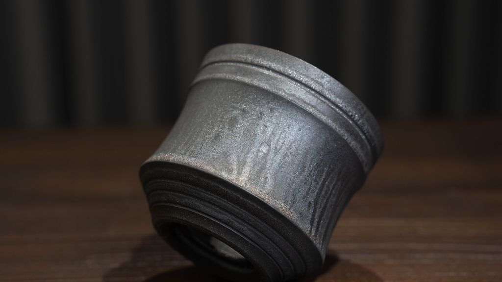 田中先生的作品採用獨特的黑土燒製,呈現出沉穩厚實的質感。即便是不施釉的素燒,也能展現自然渾厚的深黑色調。更令人驚艷的是他自創的「黑金」釉藥系列,隨著角度與光線的變化,會折射出層次豐富的色澤變化——低調卻極具存在感,是那種一眼就會被吸引、越看越著迷的作品。